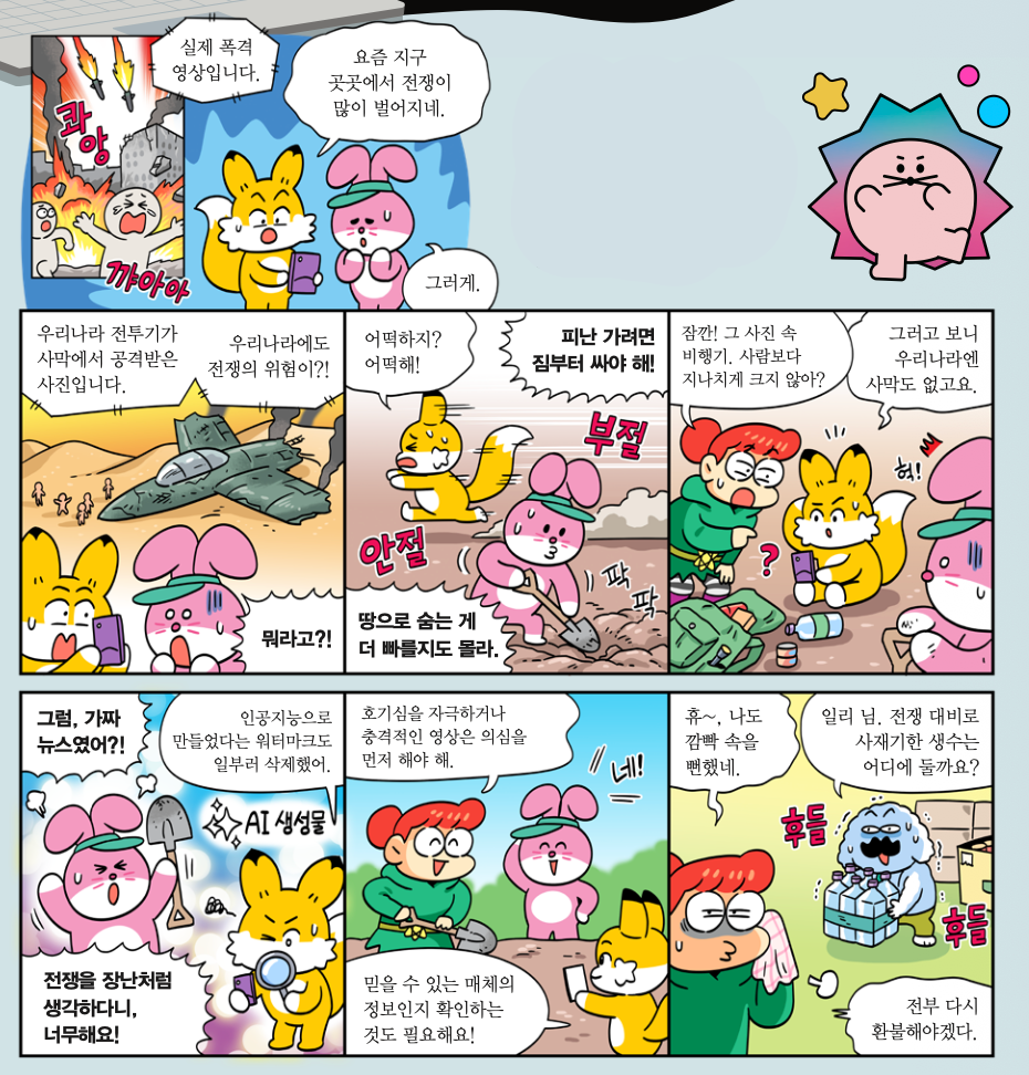 최근 세계 곳곳에서 전쟁이 벌어지면서, 매일같이 전쟁 소식이 소셜 미디어에 올라오고 있어. 그런데 가짜 뉴스도 섞여 있다는 걸 알고 있니? 전쟁 소식을 똑똑하게 받아들이는 방법을 알아보자!