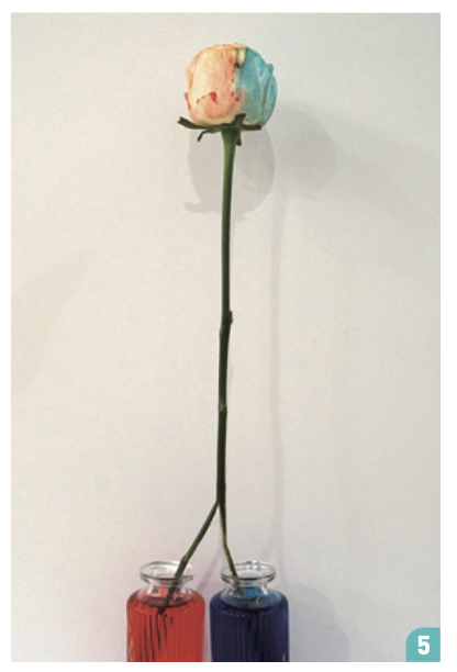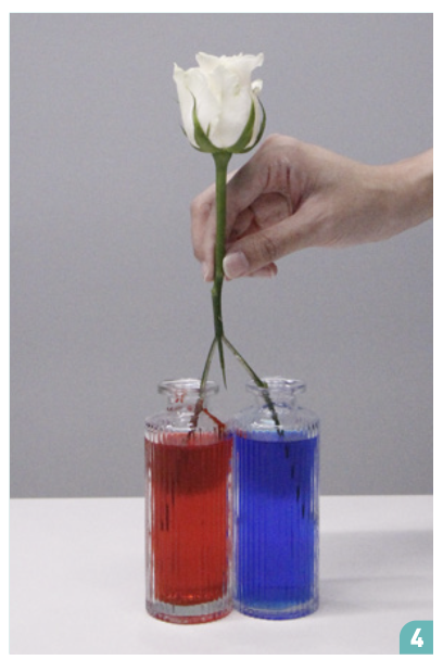 장미의 줄기를 반으로 자르면, 물관도 두 갈래로 나뉘어요. 양쪽으로 나뉜 물관은 각각 빨간색과 파란색 물이 담긴 유리관에 꽂혔어요. 물관은 물을 위로 끌어올리고, 이때 물에 섞여 있던 식용 색소도 함께 이동해요. 꽃잎에 도착한 물은 꽃잎의 세포와 조직 사이로 스며들어 색을 입혀요. 시간이 지날수록 색소가 더 많이 흡수되기 때문에, 대략 24시간 후에는 흰 장미가 빨간색과 파란색으로 물들게 됩니다.