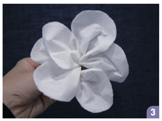 ➌ 자른 휴지를 꽃 모양으로 돌돌 만 뒤, 아랫부분을 조이고 테이프를 붙인다.