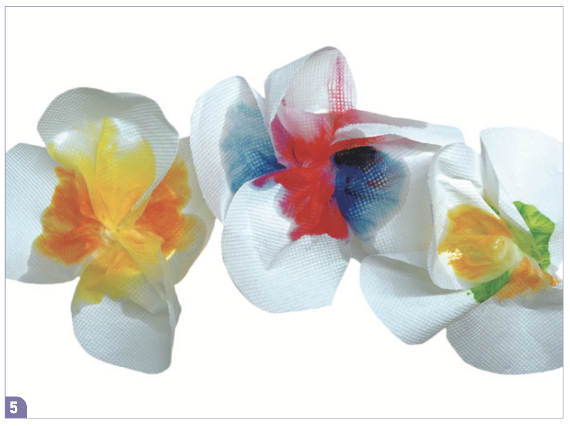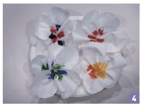 모세관 현상에 의해 꽃병에 담긴 물이 휴지 섬유를 타고 위로 올라가면, 물은 싸인펜으로 칠한 휴지 꽃의 안쪽 부분까지 닿아요. 사인펜의 잉크는 물에 녹는 성질이 있어요. 따라서 물이 닿는 순간 잉크가 물속으로 녹기 시작합니다. 잉크가 녹아 든 물은 다시 모세관 현상에 의해 휴지 전체로 퍼져 나가요. 그 결과, 처음에 한곳에만 칠했던 사인펜의 색이 꽃잎 전체로 번지게 되는 것이랍니다.