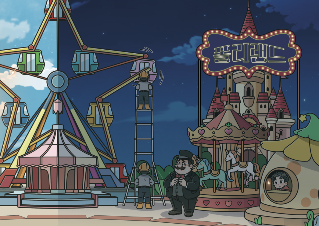 하늘 위 불빛 사이로 ‘폴리랜드’라는 글자가 반짝였다. 놀이기구는 알록달록 눈부셨고, 아이들의 눈도 따라 반짝였다. 폴리랜드 놀이공원 사장이 웃음 띤 얼굴로 아이들에게 초대장을 나누어주었다. 초대장에 금빛 글씨로 쓰여 있었다. ‘내일, 새 놀이기구 ‘펜타스톰’ 운영 시작!’