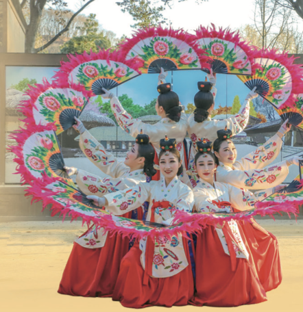 구성진 악기 소리가 퍼지는 이곳은 경기도 용인시에 있는 ‘한국민속촌’이야. 음악을 따라가니 눈앞에 부채춤 공연이 펼쳐졌어.