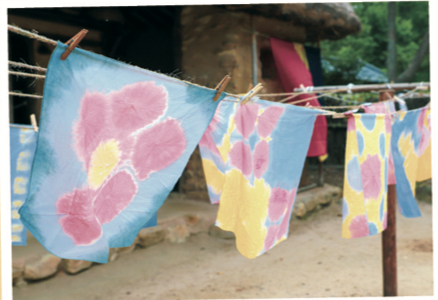 흰 천을 접어 묶은 뒤, 물감에 퐁당! 묶인 부분에는 색이 스며들지 않아서 천을 펼치면 알록달록 다양한 무늬가 나타나지.
