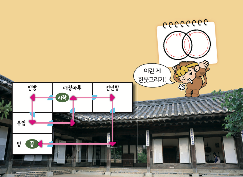 이번엔 한옥을 이리저리 돌아다니며 문을 한 번씩 통과하다 보니, 어느새 전체를 돌아보고 밖으로 나왔어. 마치 ‘한붓그리기’ 같잖아? 연필을 종이에서 떼지 않고 같은 선을 두 번 지나지 않게 그리는 걸 한붓그리기라고 해.