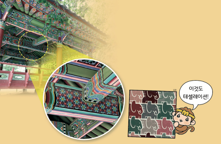 한옥처럼 옛날식 집의 지붕과 기둥에 알록달록 그린 무늬를 ‘단청’이라고 해. 같은 무늬가 빈틈없이 공간을 채우는 걸 볼 수 있는데, 수학에서는 이런 걸 ‘테셀레이션’이라고 부르지!