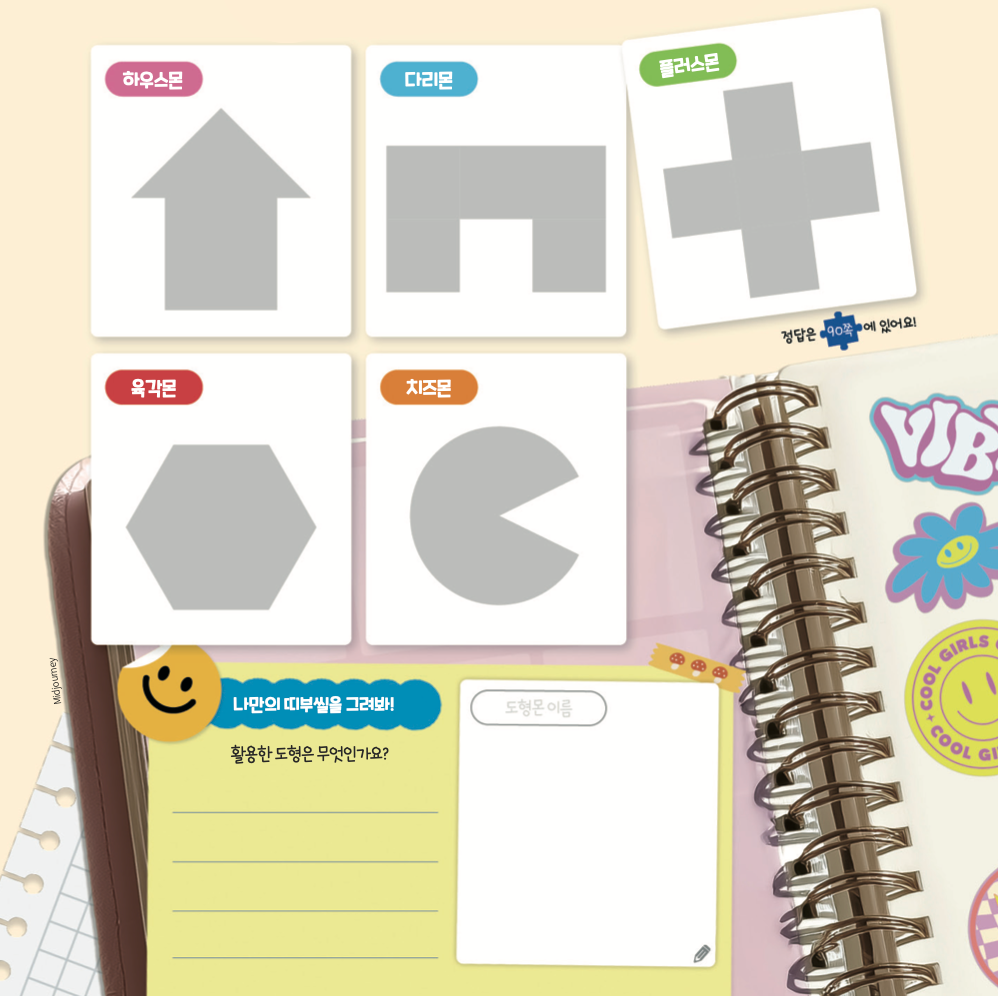 내가 제~일 좋아하는 깜찍 도형몬빵! 띠부씰을 벌써 5개나 모았지! 어라? 근데 내 소중한 띠부씰이 다 떼어져 있잖아? 빈자리에 알맞은 도형몬 스티커를 붙여서 원래대로 만들어 줄래?