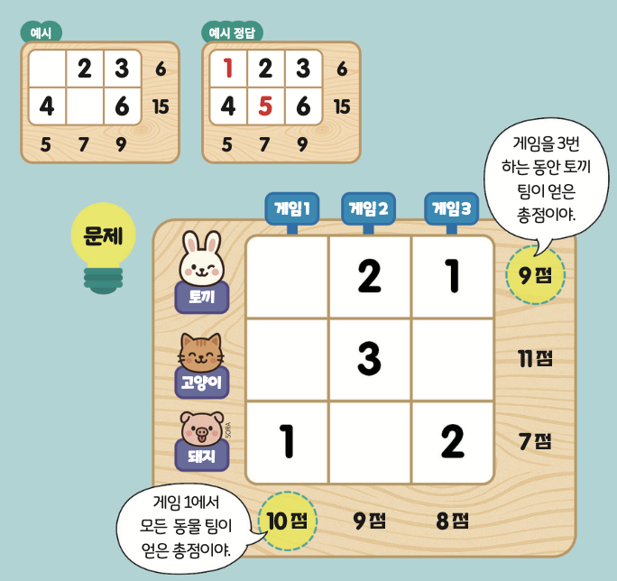 토끼, 고양이, 돼지 팀이 게임을 한 뒤 점수를 기록했어요. 그런데 숫자 몇 개가 지워졌네요! 그래도 괜찮아요. 점수판 옆에 총점을 적어 놨거든요. 총점을 보고, 비어 있는 점수판을 채워봐요.