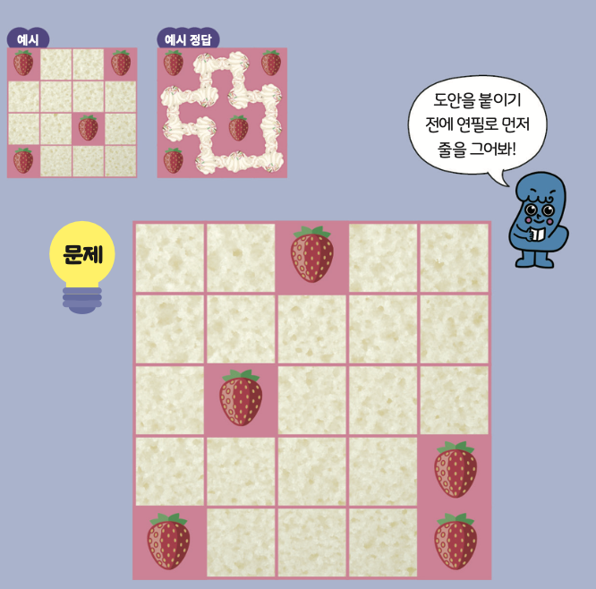 95쪽 도안을 붙여 맛있는 딸기 생크림 케이크를 만들어요! 생크림이 딸기 칸을 제외한 모든 칸을 한 번씩 지나고, 모두 한 줄로 연결되어야 해요.