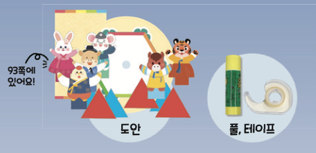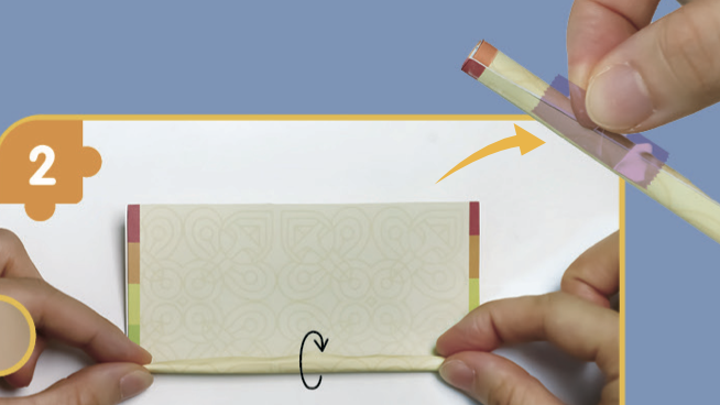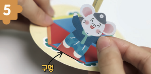 팽이 아래로 나온 동물 도안은 안쪽으로 접은 뒤, 테이프를 붙여 고정해요.