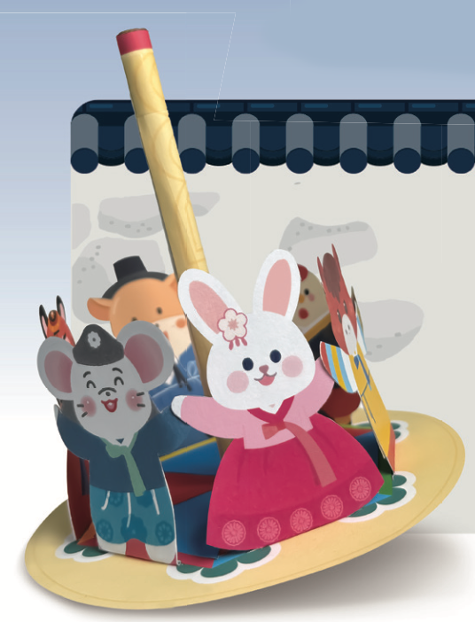 한복을 입은 동물들이 색깔 팽이 위에서 손을 맞잡았어요.