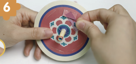 팽이를 뒤집은 다음, 아래로 나온 막대와 팽이 바닥면을 테이프로 단단히 붙여요.