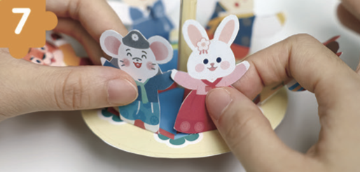 모든 동물을 팽이에 고정한 다음, 각 동물의 손에 풀을 칠해 서로 이어 붙여요.