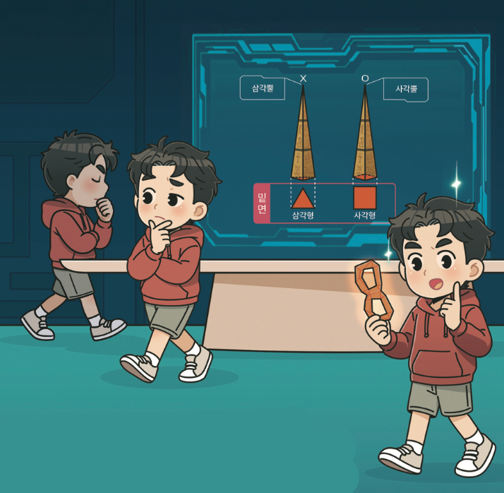 “여러분! 이 박물관은 밑면이 사각형인 사각뿔로 기둥을 지어야 했는데, 밑면이 삼각형인 삼각뿔로 기둥을 잘못 만들었습니다! 사각뿔과 삼각뿔 모두 옆면은 삼각형이지만, 중요한 건 밑면입니다! 각뿔의 이름은 밑면의 도형으로 정해집니다.”