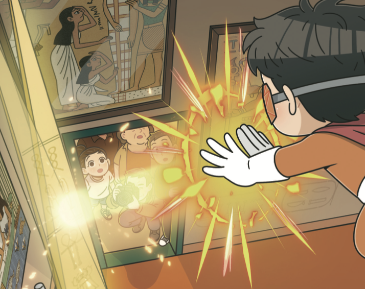 다음 날, 박물관은 기념행사로 발 디딜 틈이 없었다. 그때였다. 쿵—! 박물관 기둥 하나가 크게 휘청이며 벽에 금이 가기 시작했다. 사람들이 비명을 지르며 흩어지는 그 순간, 하늘에서 도형맨이 빛과 함께 내려왔다.