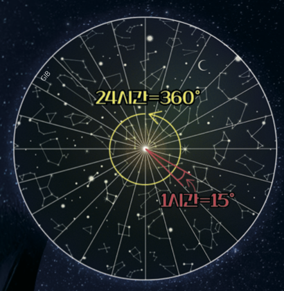 지구는 24시간에 360°(도)를 돌아요. 1시간마다 15°씩 돌아가는 셈이지요.