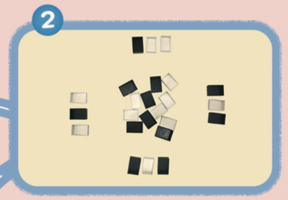모든 타일을 뒤집어 섞은 뒤, 색깔에 상관없이 각자 3개씩 가져가요. 남은 타일은 책상 가운데에 둬요.