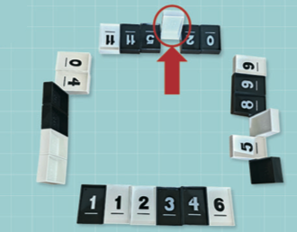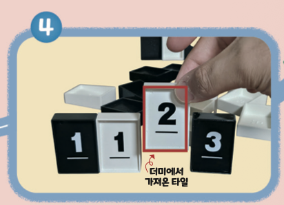 타일을 확인한 뒤, 자신만 볼 수 있도록 앞에 세워요. 숫자 순서대로 두되, 같은 숫자가 있으면 검은색 타일을 흰색보다 왼쪽에 둬요.