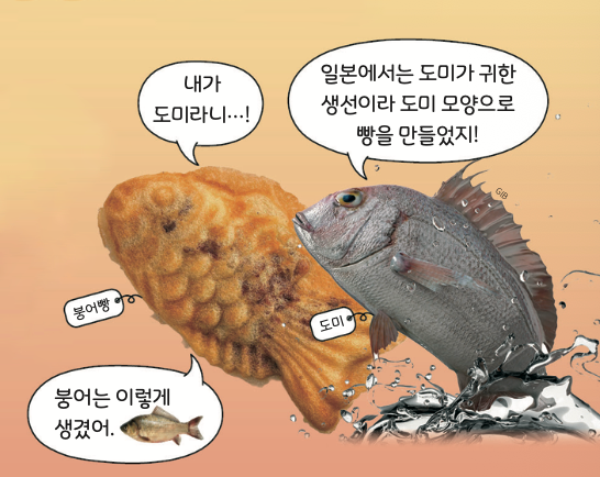 붕어빵은 일본의 ‘도미빵’이 모양 그대로 우리나라에 전해진 음식이에요. 붕어와 도미, 어떤 점이 같고 어떤 점이 달라 보이나요?
