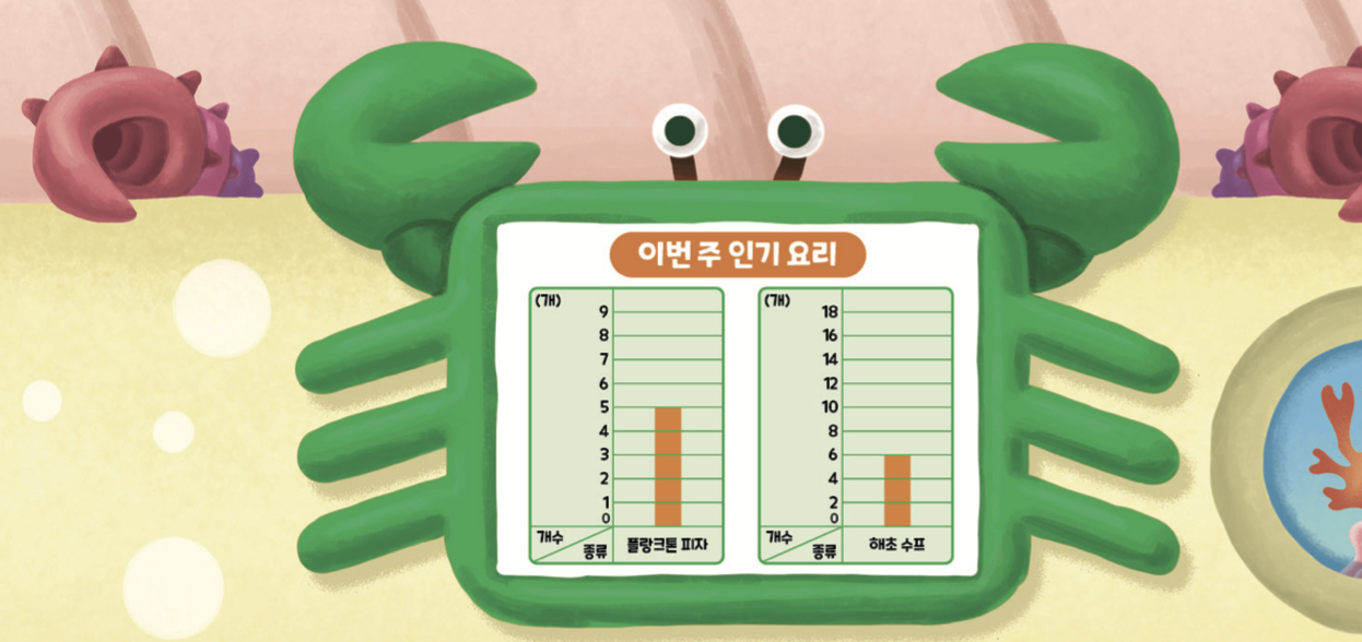 그런데 기차의 식당칸에서 승무원 아리와 송이가 말다툼하고 있네요? 모니터에 ‘이번 주 인기 요리’ 그래프가 떠 있었어요.