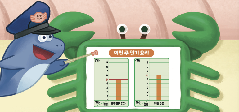 “그래프 눈금 한 칸이 얼마만큼인지 봐야 해. 플랑크톤 피자는 막대가 길지만 한 칸이 1을 뜻하기 때문에 5개이고, 해초 수프는 막대가 짧지만 한 칸이 2를 뜻해서 6개야. 그러니 해초 수프가 더 인기가 많았어. 두 그래프 모두 눈금을 1로 하니, 한눈에 비교할 수 있지?”