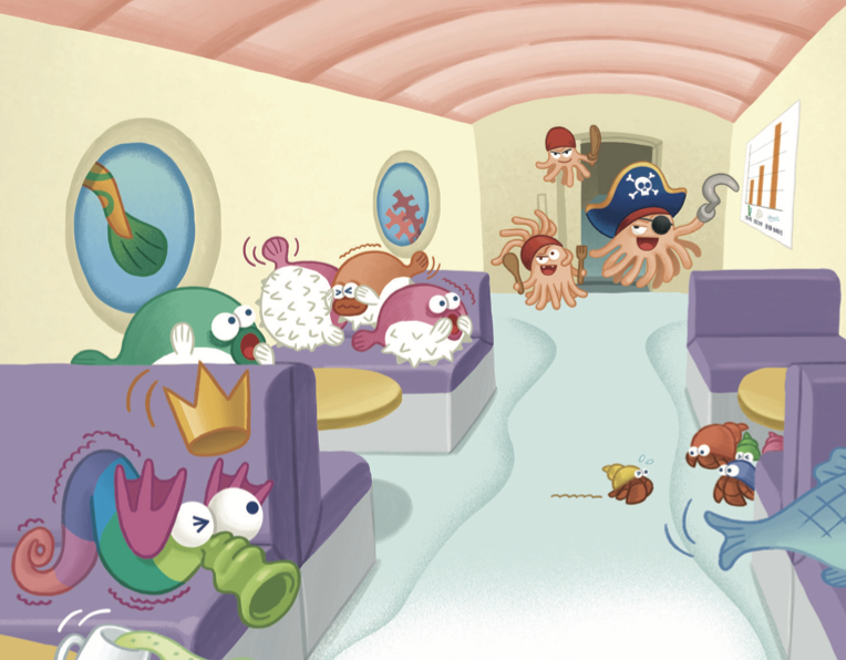아리와 송이는 음식 창고를 정리하고 있었어요. 바로 그때였어요. 쿵쾅쿵쾅! 덜컹덜컹! 끈적끈적 말미잘 해적단이 들이닥쳤어요.