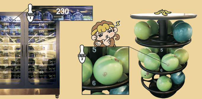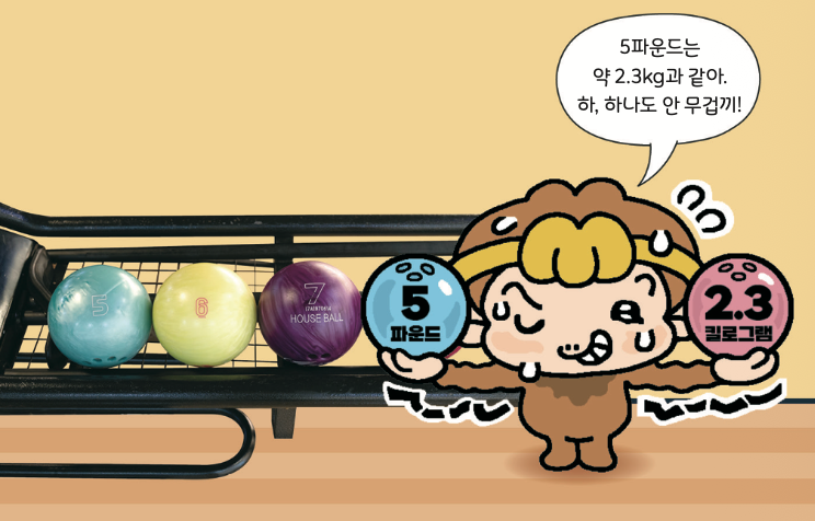 볼링공에 적힌 숫자 5, 6, 7, …은 공의 무게를 나타내. 공이 5kg이 넘는 거냐고? 볼링공은 ‘kg(킬로그램)’이 아닌 ‘lb(파운드)’라는 무게 단위를 사용해. 숫자 5는 ‘5파운드’를 의미하지. 1파운드는 약 0.45kg과 같아. 초등학교 저학년생에겐 5~7파운드 볼링공을 추천!