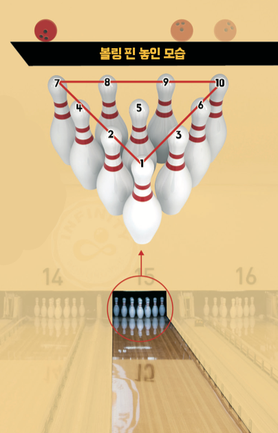 볼링 핀은 거꾸로 된 삼각형인 ‘역삼각형’ 모양으로 놓여 있고, 위치에 따라 번호가 있어. 여기서 꿀팁! 핀 10개를 한 번에 쓰러뜨리려면 1번과 2번, 또는 1번과 3번 핀 사이로 공을 굴려봐. 1번 핀 정면에 공이 맞을 때보다 맨 뒷줄 7번, 10번 핀까지 도미노처럼 잘 넘어지거든.