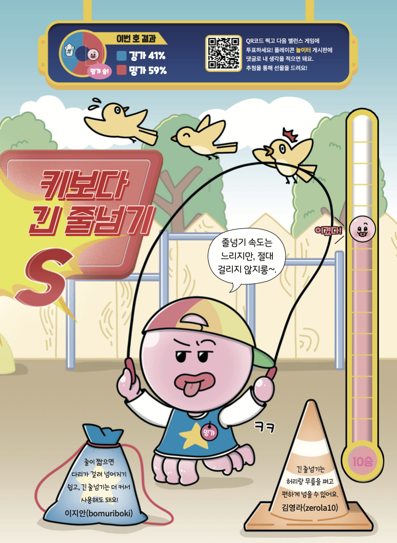 더 많은 독자들의 마음을 사로잡으면 레벨 업! 아래 상황에서 여러분이라면 깅가? 밍가? 어느 쪽을 고를 건가요? 다음 승부 결과는 여러분의 투표에 따라 달라질지도 몰라요!