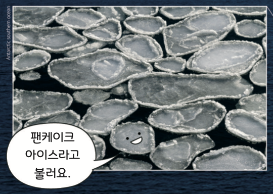 바다 위에 가득한 동그란 얼음판! 바람과 파도에 부딪히며 둘레가 둥글게 변한 거예요.