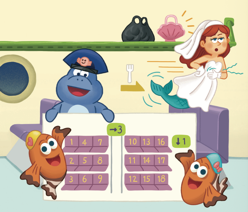 아리와 송이는 좌석표에 화살표 스티커를 척 붙였어요. 승객들은 차례로 자기 자리를 찾기 시작했어요. 인어 공주는 결혼 선물인 진주 목걸이를 조개 가방에 넣어 선반 위에 올려 두고 식당칸으로 저녁을 먹으러 갔어요.