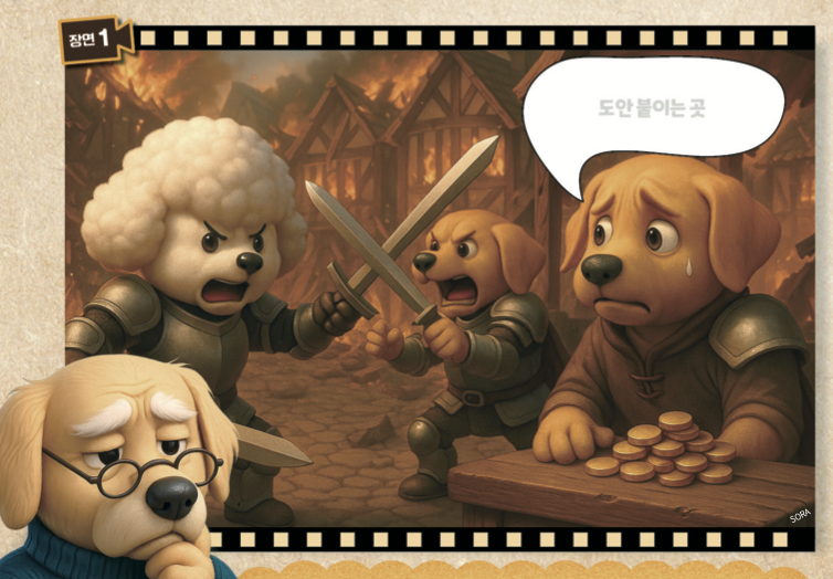 70년 전, 골댕 마을은 삐숑 마을과 큰 전쟁이 있었단다. 채소 값도 오르락내리락할 만큼 경제가 불안해서, 모두가 금을 사려 했지.