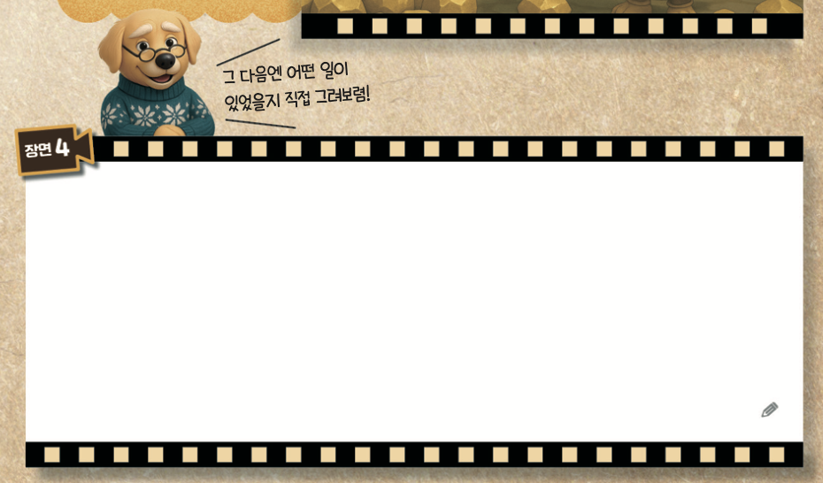 할아버지의 이야기를 듣고, 95쪽에서 도안을 뜯어 장면에 어울리는 말풍선이나 그림을 붙여 보세요. 마지막 장면은 여러분이 직접 완성해 보세요!