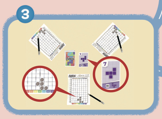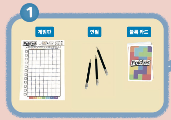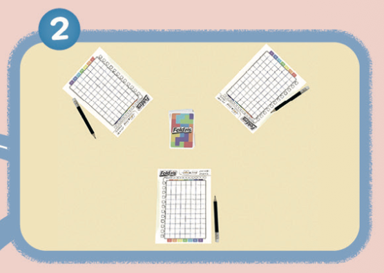 각자 게임판과 연필을 하나씩 받아요. 블록 카드는 잘 섞어 뒷면이 보이도록 책상 가운데에 더미로 놓아요.
