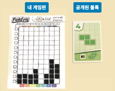 아무나 더미에서 카드 1장을 뒤집고, 카드에 나온 블록 모양을 각자 게임판에 연필로 칠해요. 단, 블록이 아래로 떨어진다면 놓일 수 있는 위치에 칠해야 해요.