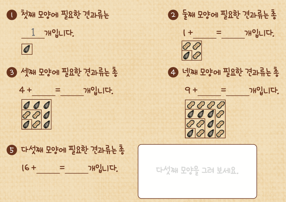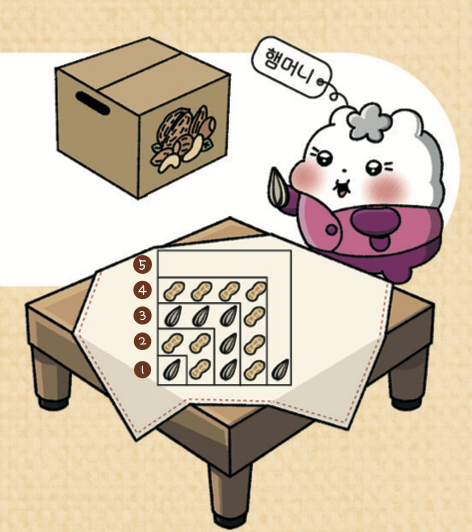 햄머니가 해바라기씨와 땅콩을 탁자 위에 번갈아 규칙대로 정리하고 있어요. 다섯째로 만들 모양에 필요한 견과류는 총 몇 개일까요?