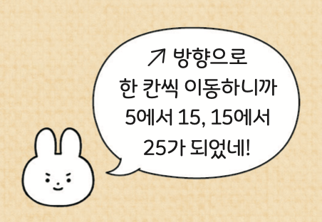 ❸ ↗ 방향으로 한 칸씩 이동할 때, 수는 __________씩 커집니다.
