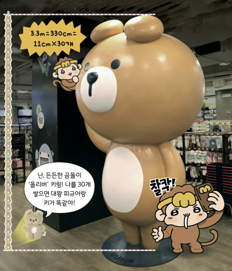 가장 큰 피규어는 약 3.3m(미터)나 돼. 11cm(센티미터)인 키링보다 30배나 키가 크다니, 정말 어마어마하잖아?