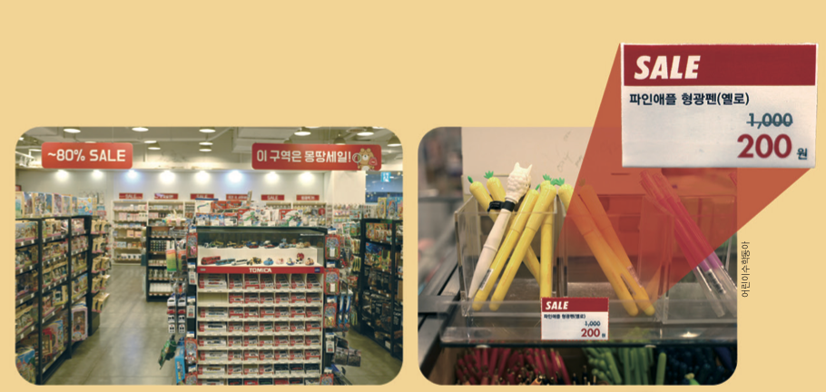여긴 전국 아트박스 중 딱 5곳만 있는 특별한 코너야! 펜, 키링, 생활용품 등 다양한 물건을 정가★보다 훨씬 싸게 팔고 있지. 80% 할인이면, 1000원 중 800원을 빼고 파는 셈! 그래서 형광펜을 200원에 살 수 있어. 이 정도면 나도 지갑을 열 수밖에 없겠는걸? 끼끼~!