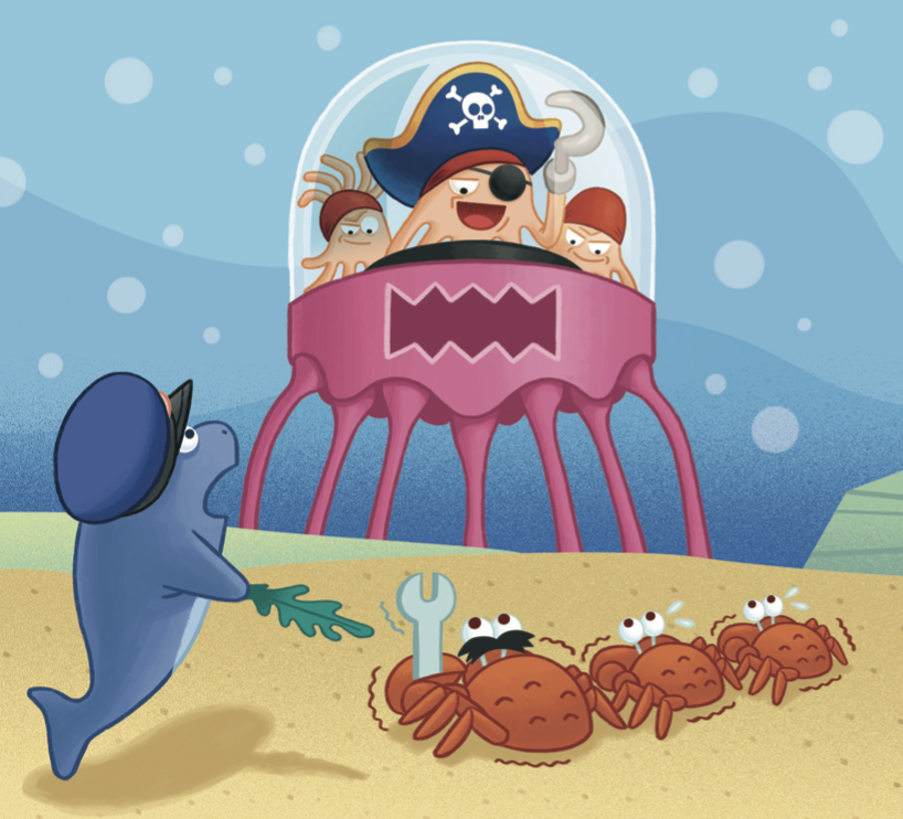 끈적끈적 말미잘 해적단이 잠수함을 타고 나타나 바다열차 777호를 둘러쌌어요.