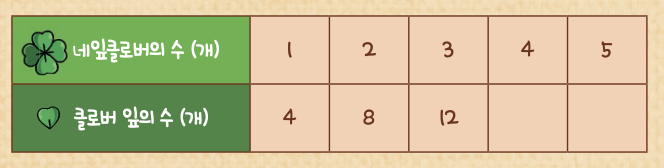 토동이가 정원에서 네잎클로버를 찾고 있어요. 네잎클로버의 수와 클로버 잎의 수 사이의 관계를 식으로 나타내면 무엇일까요?