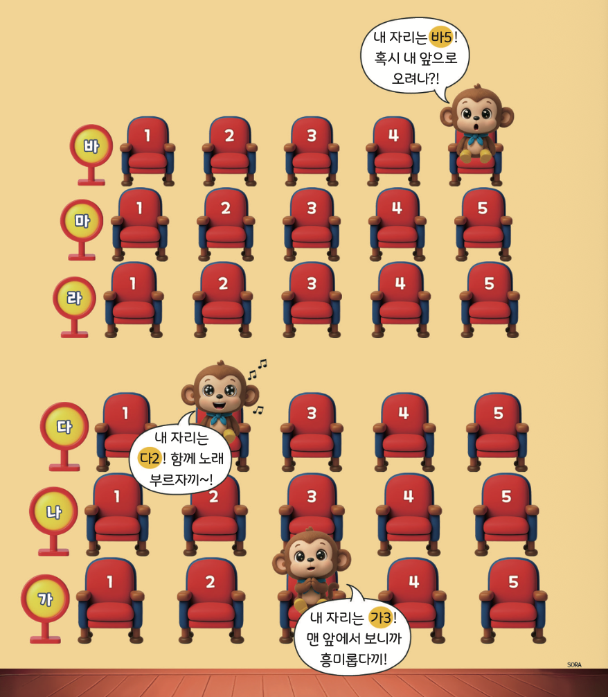 오늘 수수께끼의 정답인 숫자는 라1, 라2, 라3, 라4, 라5 자리 앞을 지나갈 거래! 좌석표를 보고 정답 숫자가 지나가는 곳에 ○ 표시해봐!