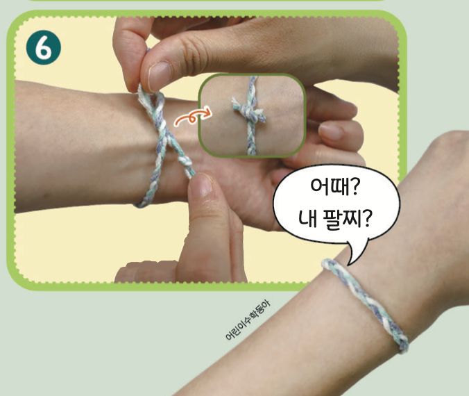 손에 팔찌를 두르고 끝을 매듭지어 묶으면 완성!