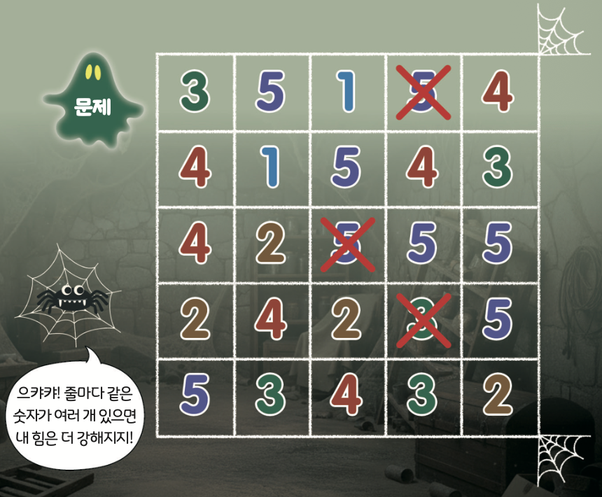 거미가 마법 거미줄을 쳐 놓았어요! 가로줄, 세로줄에 반복되는 숫자가 없게 표시해 물리쳐요. 단, 표끼리는 양옆이나 위아래로 붙어 있으면 안 돼요.