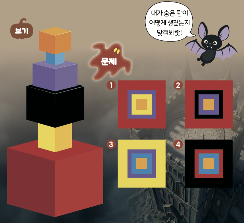 박쥐가 <보기>의 탑에 숨어 있어요. 탑을 자세히 관찰하고 위에서 내려다봤을 때 어떤 모습일지 알맞은 번호를 고르세요.