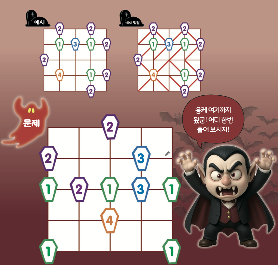 드라큘라를 봉인하라! 관과 관 사이를 대각선으로 이어요. 관에 적힌 숫자는 관에 연결된 대각선의 개수예요. 모든 칸에 대각선이 하나씩 그어져야 해요.