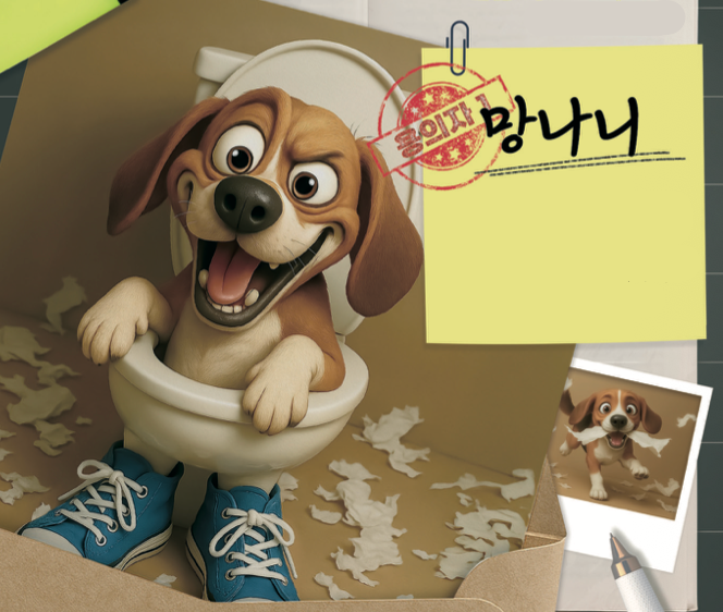 돌아다니며 늘 사고를 치는 강아지. 가장 좋아하는 장소는 변기 안. 변기에 너무 오래 있던 나머지, 한 몸이 되어 버렸다.