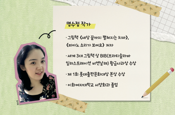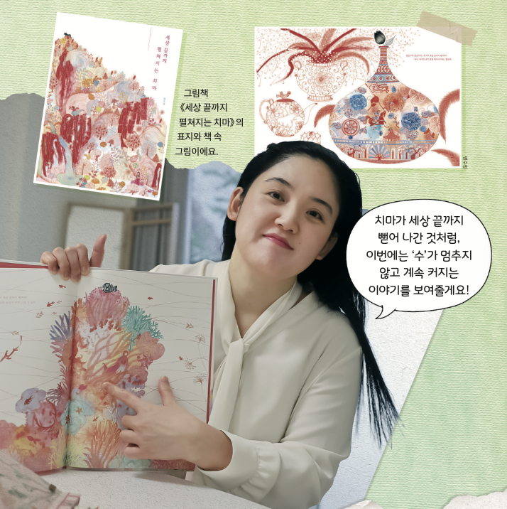 작가님은 끝없이 이어지는 것을 좋아해요. 대표작인《세상 끝까지 펼쳐지는 치마》속 주인공은 치마가 숲과 바다를 지나 우주까지 끝없이 펼쳐지죠. 이 놀라운 상상력으로 그림책 작가들의 꿈인 ‘BIB 황금사과상’을 받으며 전 세계의 주목을 받았답니다.