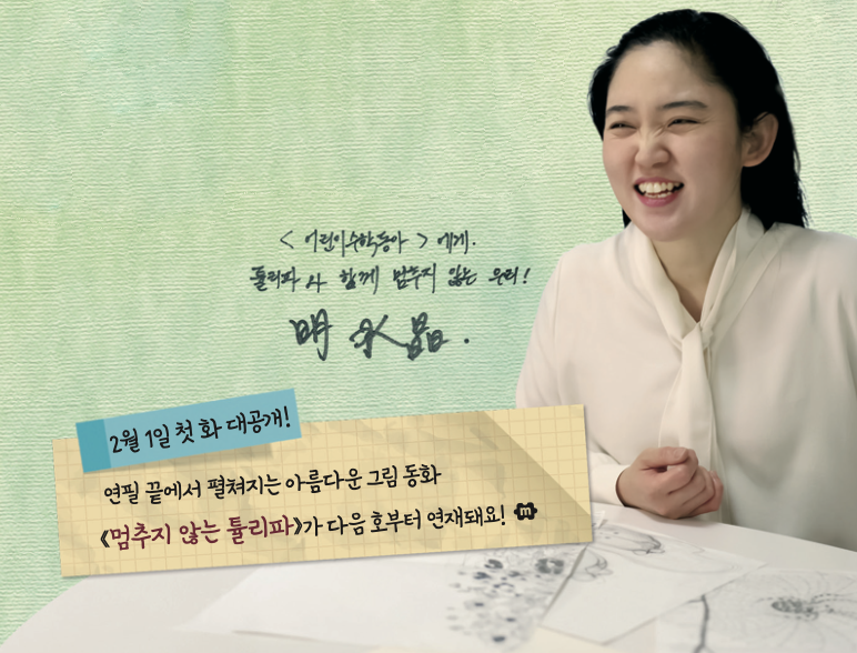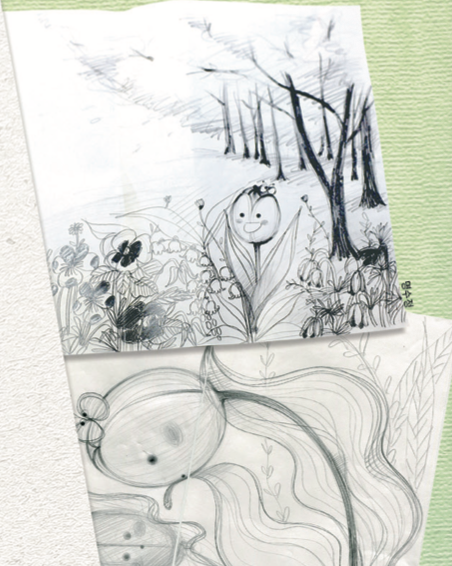 《멈추지 않는 튤리파》가 아직 세상에 나오기 전, 꼬물꼬물 그린 낙서와 아이디어가 가득해요. 명수정 작가님이 직접 들려주는 작품 이야기를 바로 들어 볼까요?