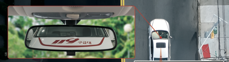 실수가 아니라 앞차에게 보내는 신호예요. 앞차가 룸미러(거울)를 통해 보면 글자가 119 구급대로 똑바로 보이지요. 앞서가는 차들이 거울을 보고 빨리 길을 비켜줄 수 있게 일부러 거꾸로 쓴 거예요
