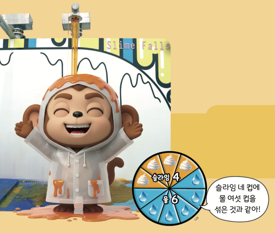 No, no! 슬라임에 물을 섞어서 딱딱하지 않아. 슬라임과 물의 비율은 4:6(사 대 육)이지!